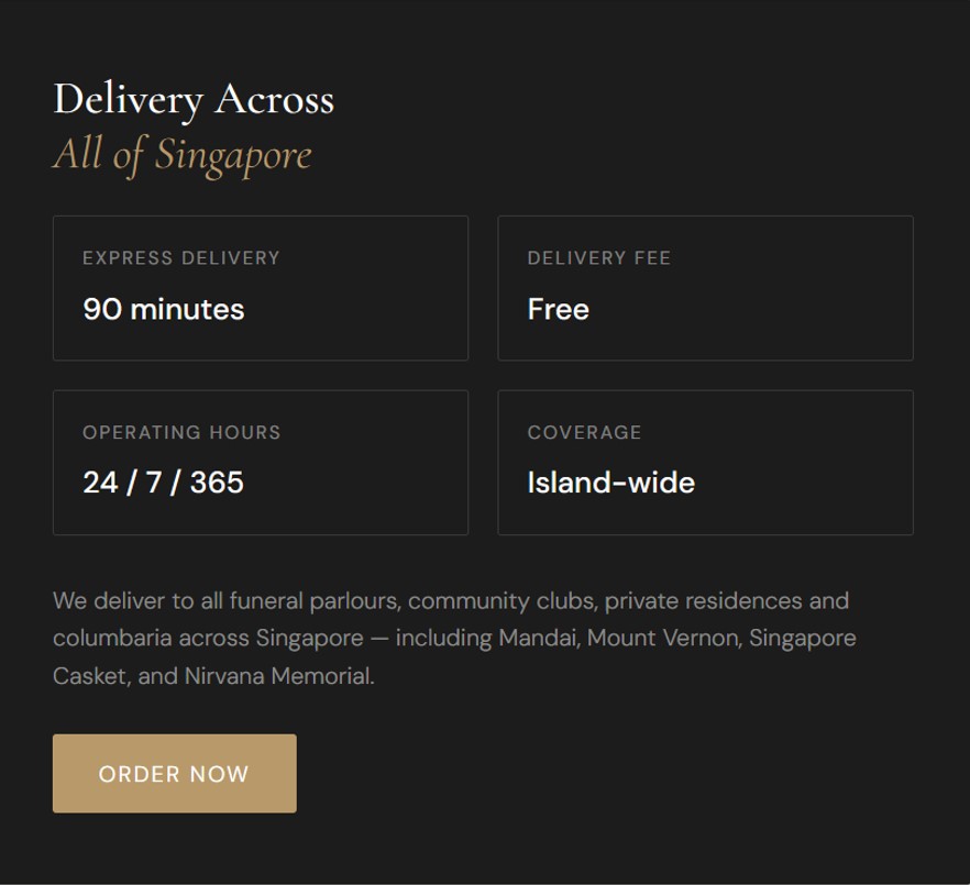 For the funeral flowers and sympathy flowers to express your condolences and thoughtful prayers, waiting is never an option. We offer excellent 24/7 condolences flower delivery to all parts of Singapore. We deliver flowers island-wide through our partnered local florists whether you want same day flower delivery or next day delivery of funeral flowers. We assure you that our island-wide flower delivery is real fast and quick because our florists are always ready to serve you 24 hours a day, seven days a week. No matter where the recipient is in Singapore, you can send flowers to wake or funeral using our reliable urgent delivery services. Show your sympathy immediately as soon as you hear the news with the most excellent funeral flowers, and let the grieving family know that you are always there to comfort and support them. TFS Funeral Florist is the name you can trust not just on flowers for different occasions but also for funeral flowers during the most difficult time.